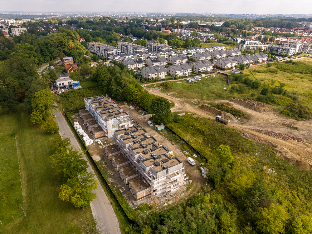 Domy w zabudowie szeregowej przy ulicy Spacerowej w Krakowie.